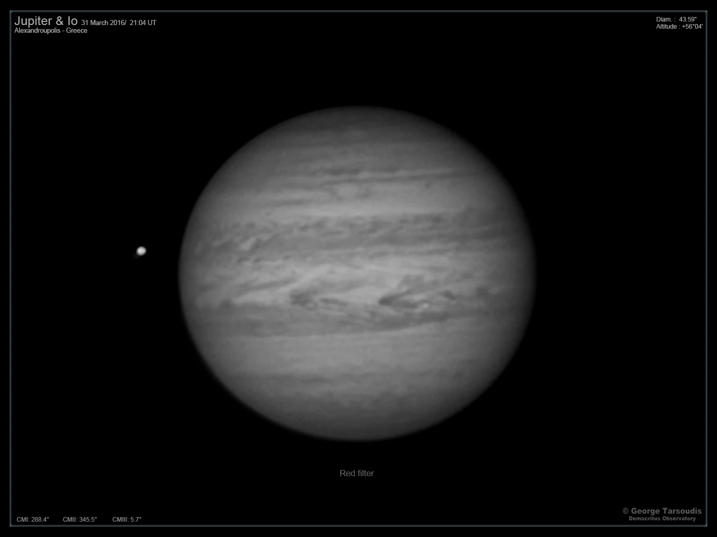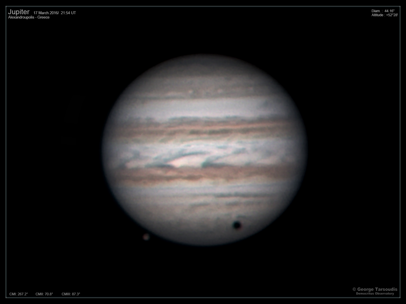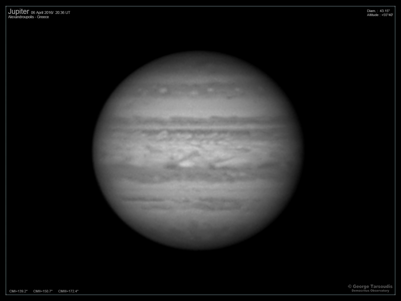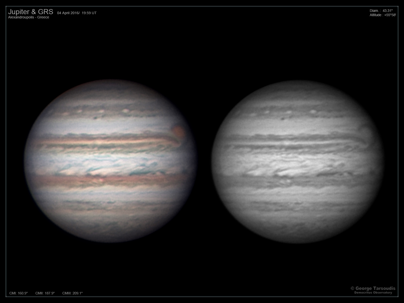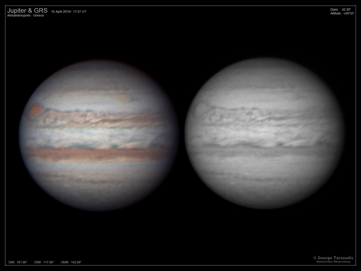 | April 16, 2016 Jupiter & GRS Condition with medium seeing and good transparency |
