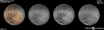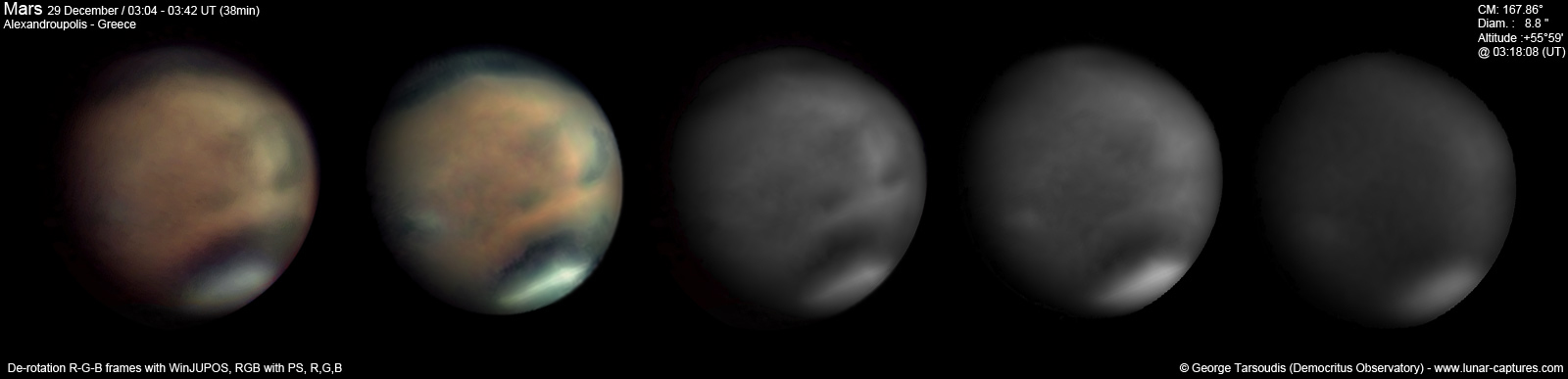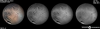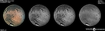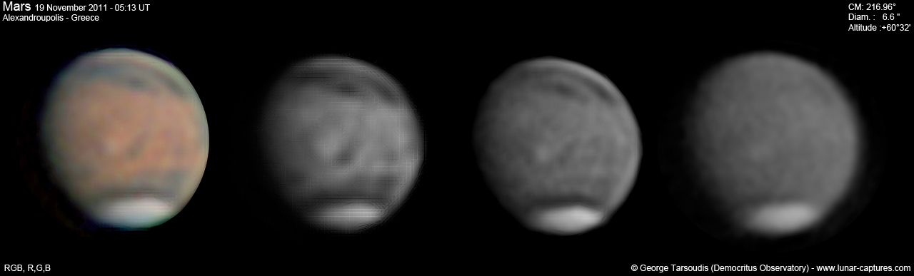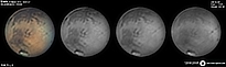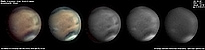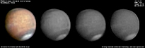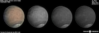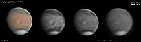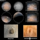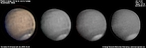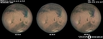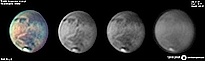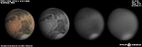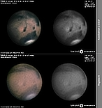| December 29, 2011 Condition not so perfect. I see something doing at the Trivium Charondis and the Cerberus, it may have clouds. The first left RGB image is my first try to work the De-rotation procedure of WinJUPOS - Amazonis - Nix Olympica (with cloudy's) - Mare Sirenium - Arcadia - Trivium Charondis and Cerberus - Elysium Mons |