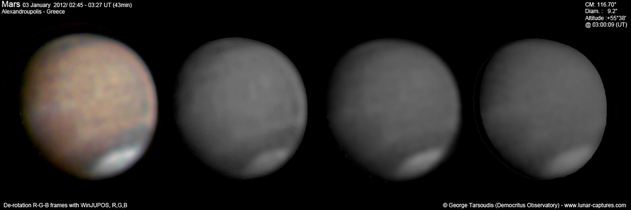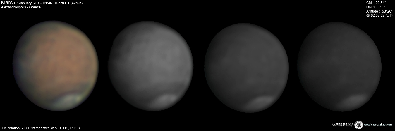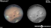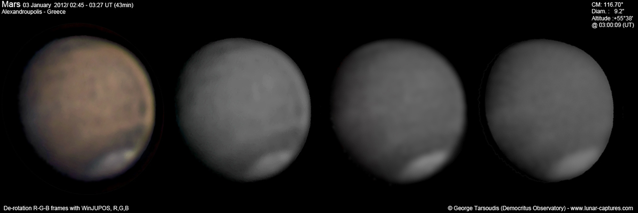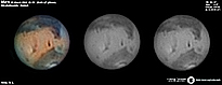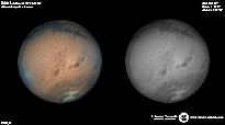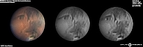 | January 03, 2012 Condition perfect with the part air turbulence. I have capture about 43min and I work the De-rotation procedure of WinJUPOS. The right image is R-G-B combine with PS - Amazonis - Nix Olympica (Olympus Mons) - Mare Sirenium - Arcadia - Phoenicis Lacus - Tharsis |
