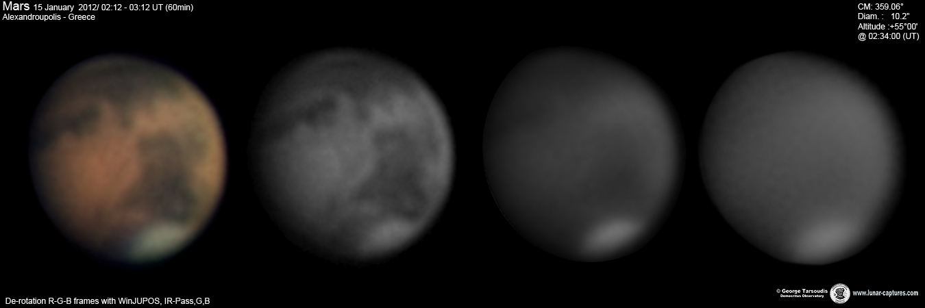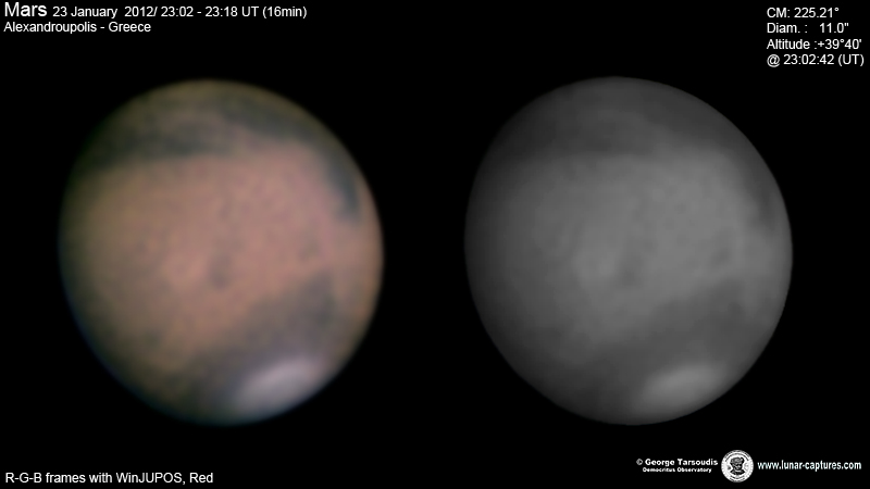 | January 23, 2012 Condition bad with many cloudys. I have capture only 16min. - Elysium - Elysium Mons - Trivium Charontis - Cerberus I - Mare Cimmerium - Mare Tyrrhenum - Syrtis Minor - Syrtis Major |
