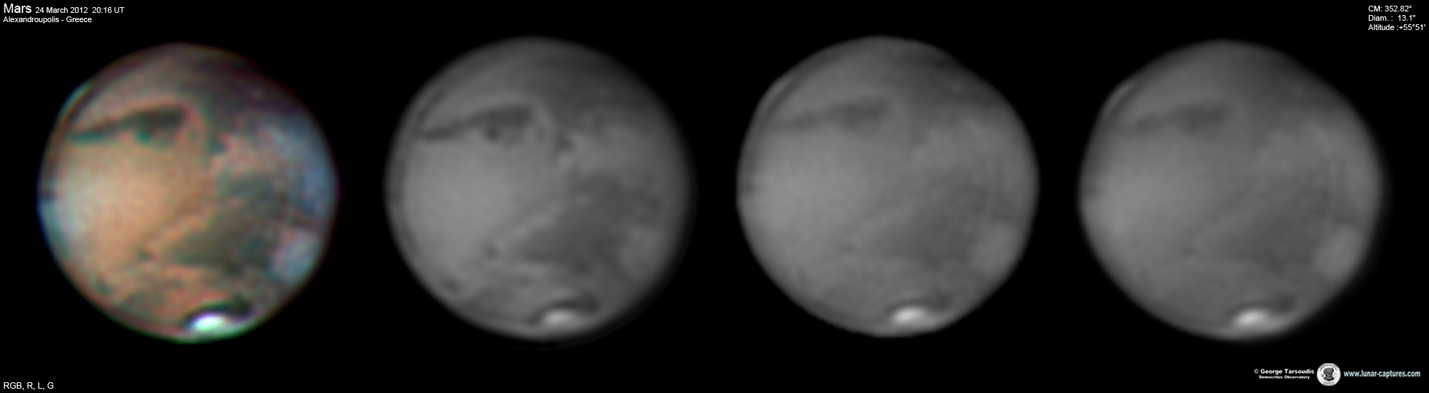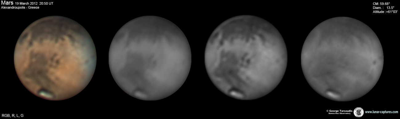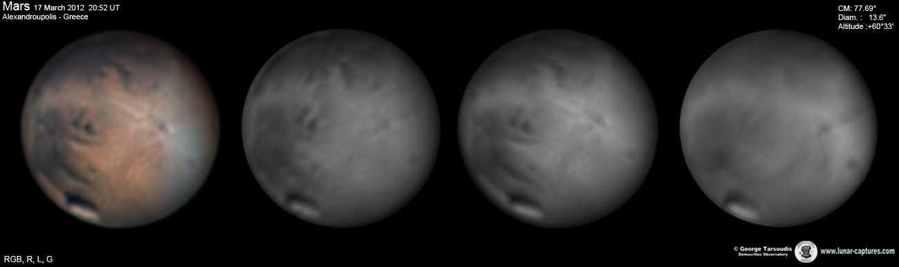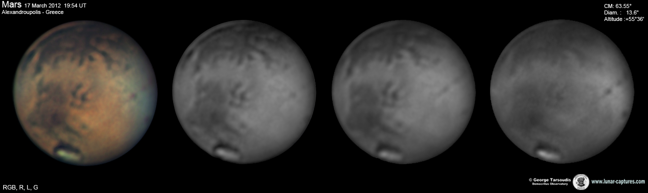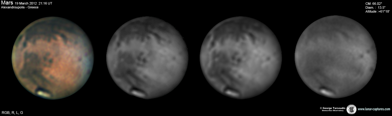| March 16, 2012 Condition average. I have capture 38min. - Nix Olympica (Olympus Mons) with cloudys - Tharsis - Arcadia - Amazonis - Phoenicis Lacus - Noctis Lacus - Claritas - Mare Sirenum |